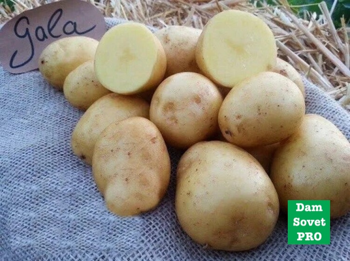 Гала – среднеранний сорт картофеля австрийской селекции, урожайность 400-500 кг/сотку. Клубни желтые, овальные, массой 100-140 г, крахмал 14%. Устойчив к болезням, засухе, подходит для всех регионов. Этот урожайный сорт картофеля хранится до весны.