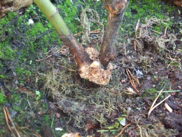 Бактериальный рак вызывает наросты на корнях и стеблях. Кусты слабеют, листья желтеют.