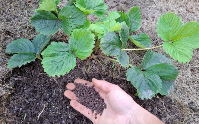 Вносите гранулы при рыхлении: 30 г на 1 м² для взрослых кустов или 60 г на 1 м² при пересадке розеток. Распределите равномерно, заделайте на 5 см в почву (если без мульчи) и полейте. Под мульчей просто отодвиньте слой, внесите удобрение и верните на место.