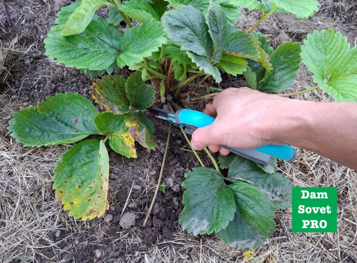 Лучше выполнять обрезку: удаляйте только старые, поврежденные или лежащие на земле листья, оставляя молодые и здоровые. Также срезайте отцветшие стебли и усы, если не планируете размножение. Для разведения оставьте 3-4 сильные розетки первого порядка на каждом кусте, а остальные усы обрежьте.