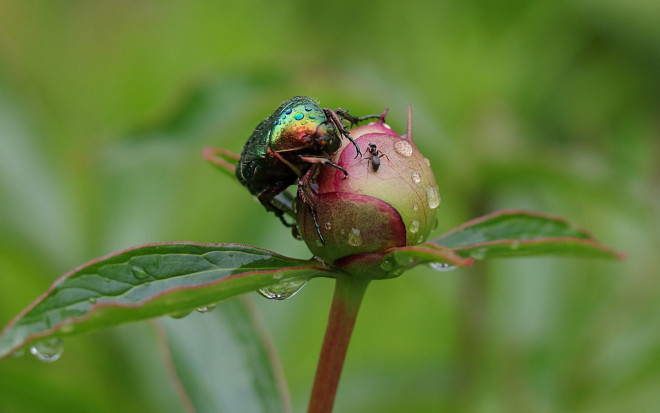 Бронзовки – крупные золотистые жуки, вредители пионов, которые объедают лепестки и пыльцу. Они особенно активны в солнечную погоду, и мои белые пионы однажды стали «обгрызанными» – цветы потеряли красоту.