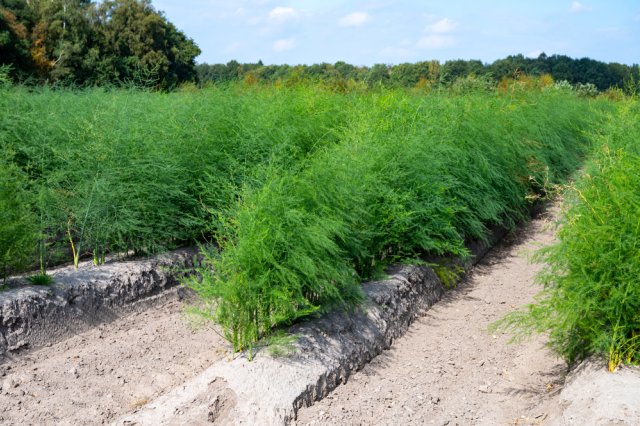 Рассада спаржи с 2-3 стеблями и развитыми корнями готова к пересадке в июне-августе. Высаживайте в открытый грунт на теплый солнечный участок — это временный рассадник для наращивания корневищ до следующей весны.
