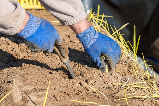 Осенью перекопайте грунт, внесите на 1 м² 6-8 кг перегноя, 30-40 г суперфосфата, 20-30 г сульфата калия. Весной, после оттаивания, выкопайте борозды 30-35 см глубиной, интервал 50 см между растениями, 1 м между рядами. На дно — 3-4 кг компоста и 15-20 г азофоски на м². Высаживайте рассаду спаржи, обильно полейте, первые дни — каждые 2-3 дня.